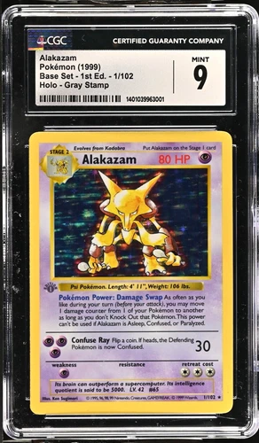 (POP 1) GRAY GREY STAMP Alakazam 1/102 1st Edition Pokemon Base Set CGC 9 Mint