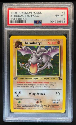 1999 Pokemon Fossil 1st Edition Aerodactyl Rare Holo #1/62 PSA 8